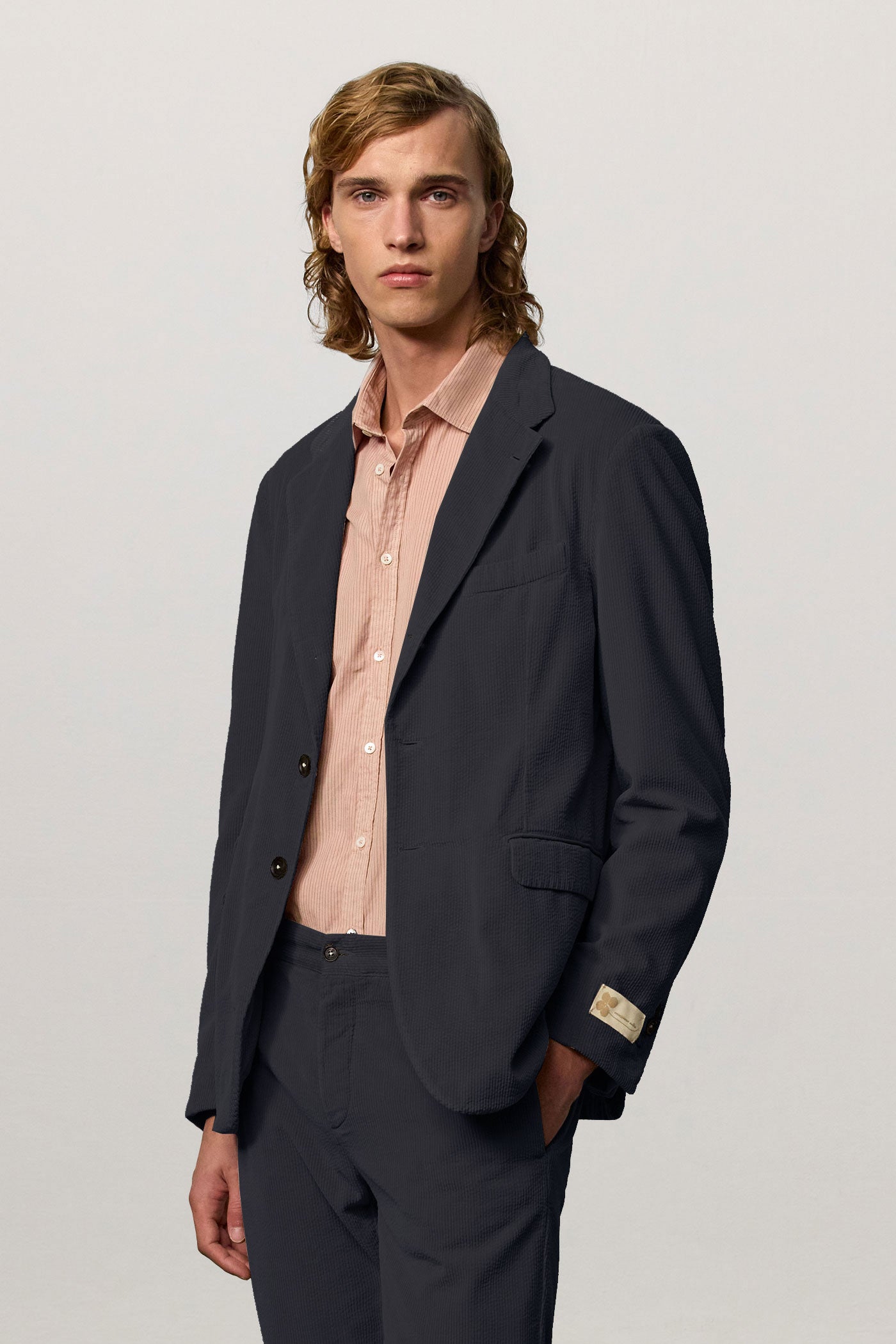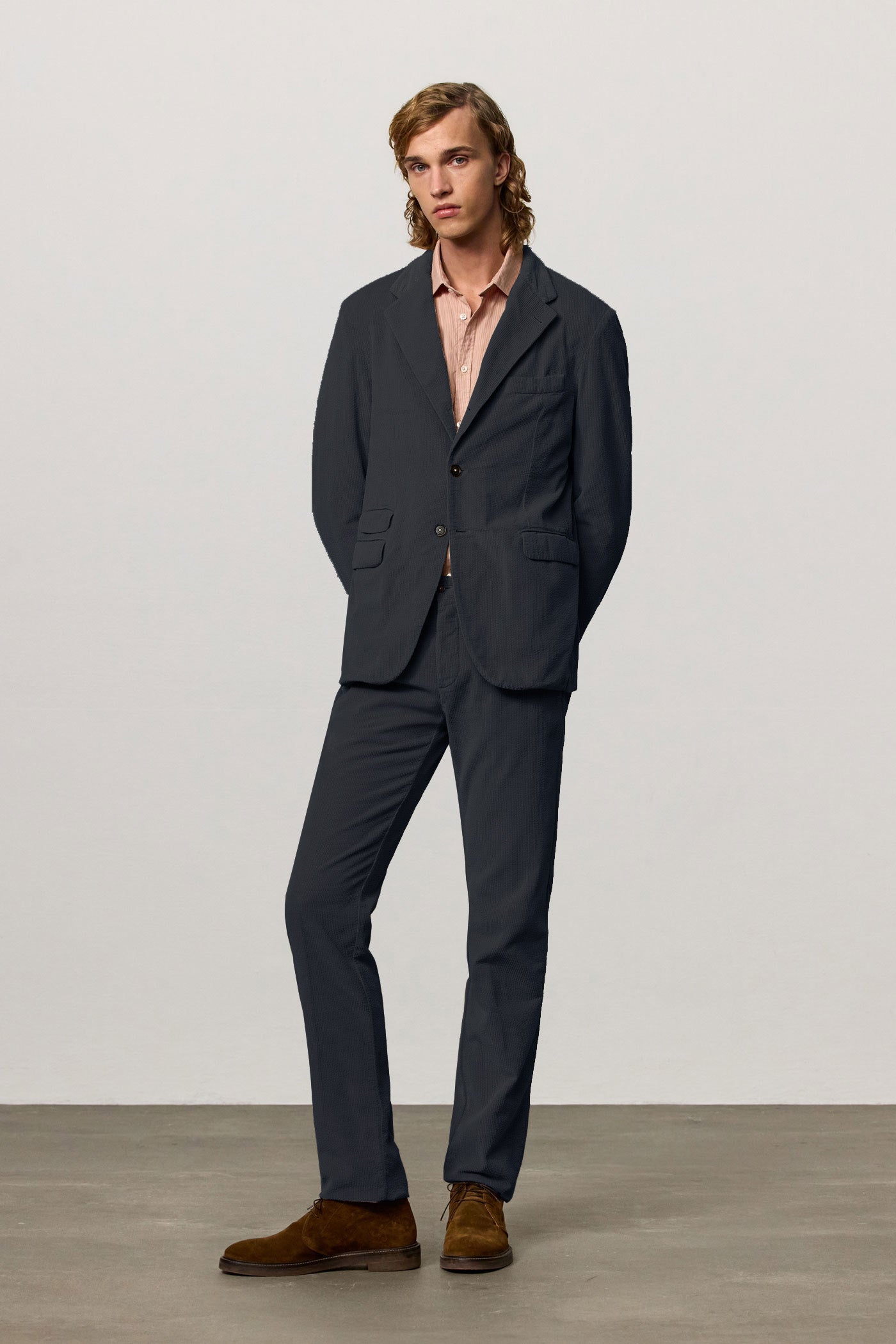 Casual deconstructed suit with three-button jacket, regular fit, classic notched lapel with stitching, flap pockets, dark horn buttons, two back vents, flat-front trousers, slim fit, straight leg, made in cotton corduroy. Made in Italy.