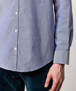 Shirt with a soft rounded collar, front closure, internal cotton voile plastron detail and embroidered crest for numbering. Pointed back yoke and rounded hem. Classic fit. Crafted from pure cotton bi-colour Oxford. Made in Italy.