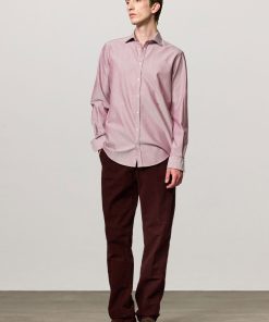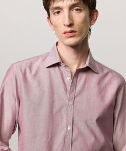 Shirt with a soft rounded collar, front closure, internal cotton voile plastron detail and embroidered crest for numbering. Pointed back yoke and rounded hem. Classic fit. Crafted from pure cotton bi-colour Oxford. Made in Italy.
