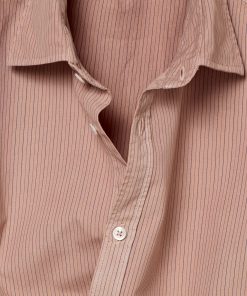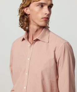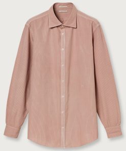 Regular-fit shirt with a pointed collar, classic soft front placket, and a cotton voilè inner bib. Made of striped watercolor cotton. Features custom badge embroidery for initials and a pointed rear yoke. Made in Italy.