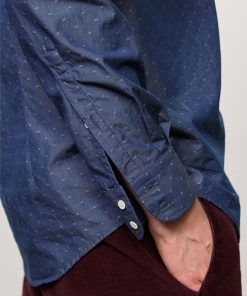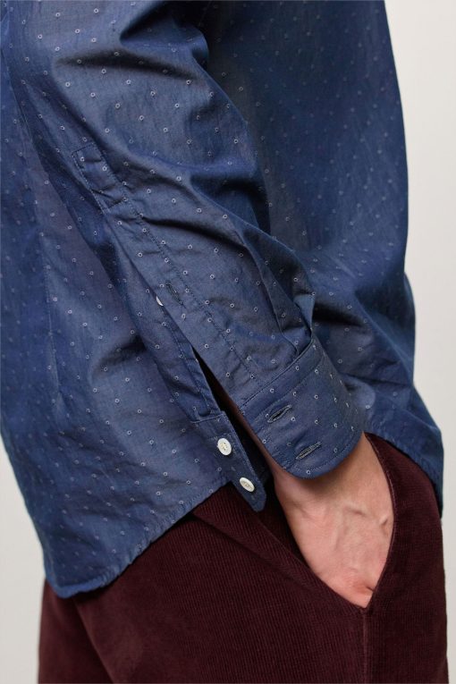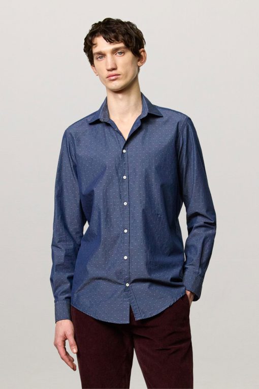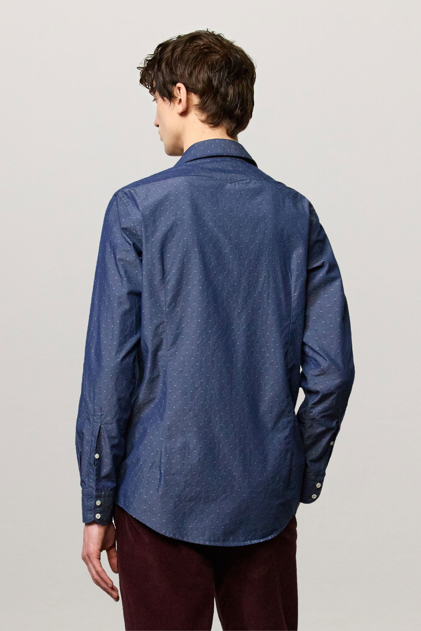 Shirt with a soft rounded collar, front closure, internal cotton voile plastron detail and embroidered crest for numbering. Pointed back yoke and rounded hem. Classic fit. Crafted from fine yarn-dyed pure cotton jacquard. Made in Italy.