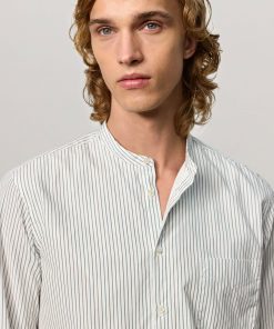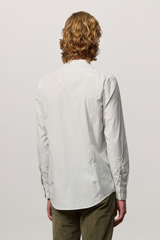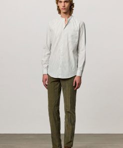 Regular-fit shirt with a grandad collar, classic soft front placket, and a cotton voile inner bib. Custom badge embroidery for initials and a pointed rear yoke. Made in Italy.