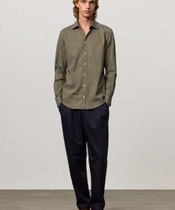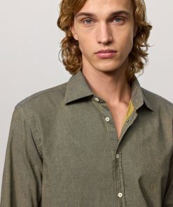 Regular-fit shirt with a pointed collar, classic soft front placket, and a cotton voilè inner bib. Made of watercolor cotton chambray. Features custom badge embroidery for initials and a pointed rear yoke. Made in Italy.
