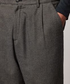 Loose-fit double-pleat trousers in peach-touch cotton micro houndstooth, featuring a front button and zip closure, slanted side pockets, and rear welt pockets. 20.3 cm leg opening. Made in Italy.