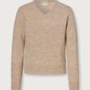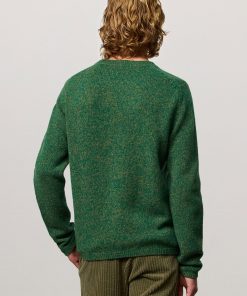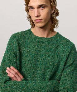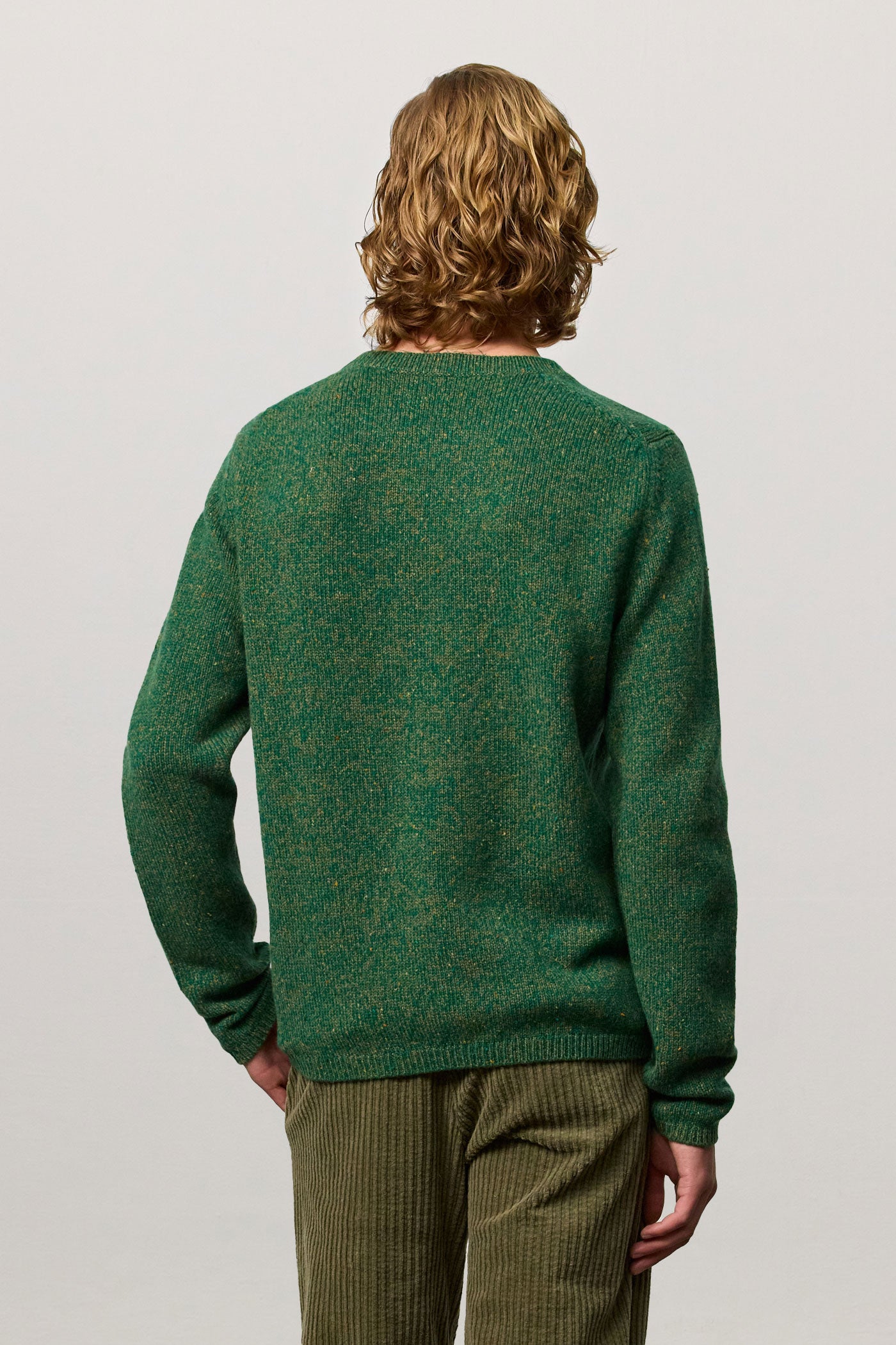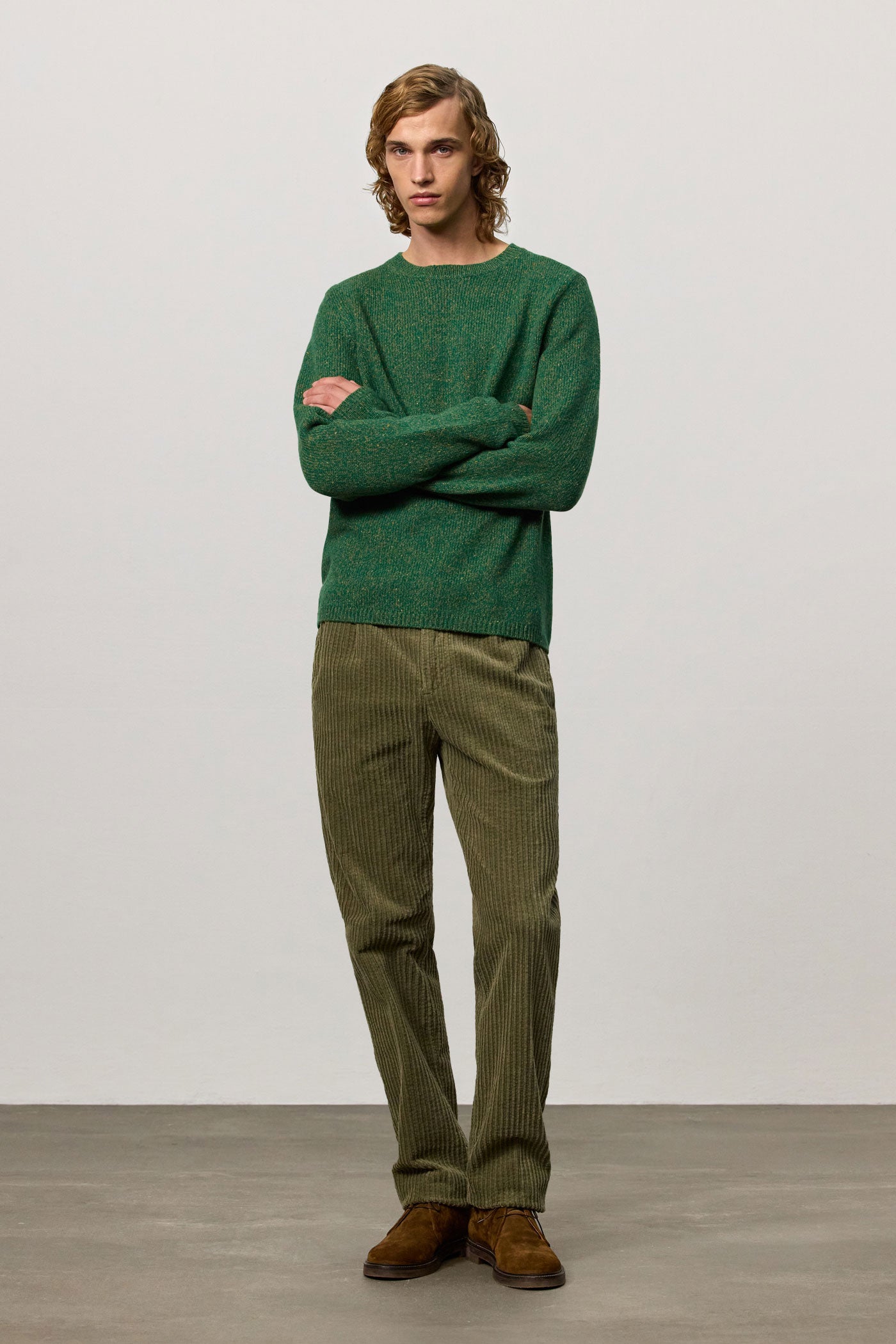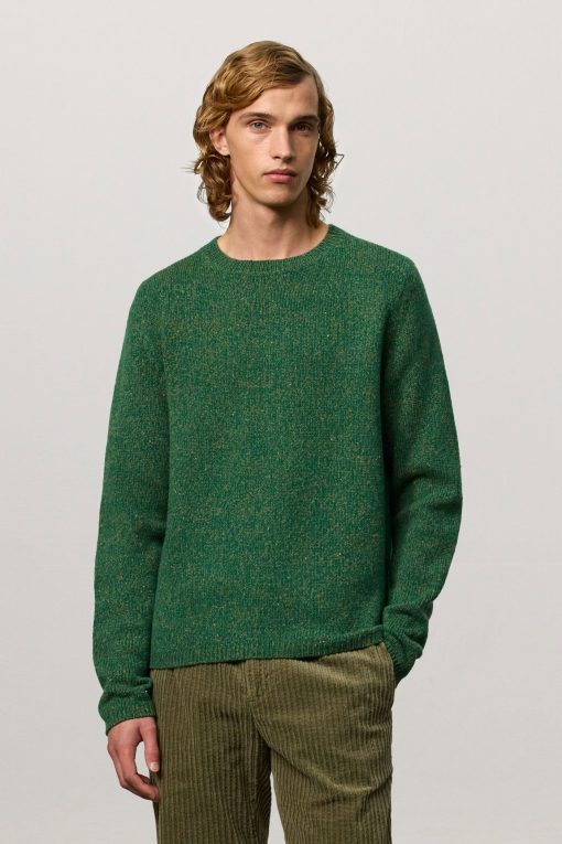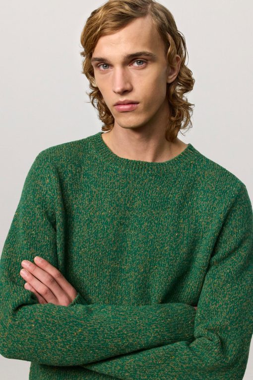 Ribbed knit crew-neck with collar and ribbed borders, regular fit, made of soft mouliné virgin wool. Made in Italy.