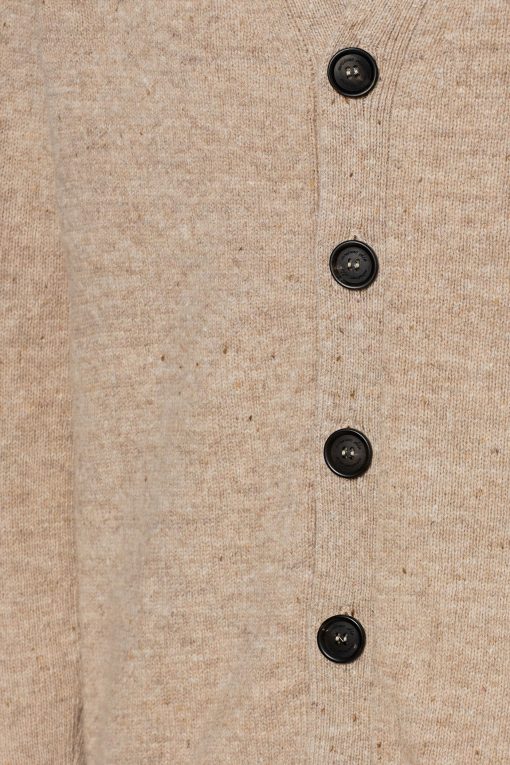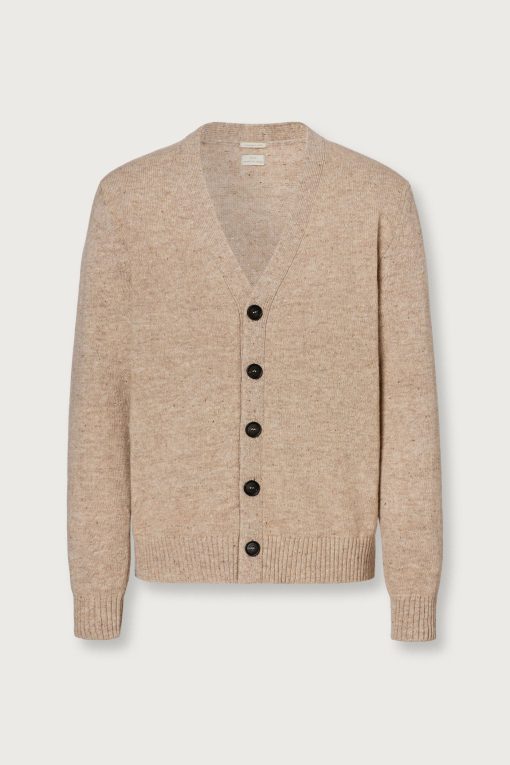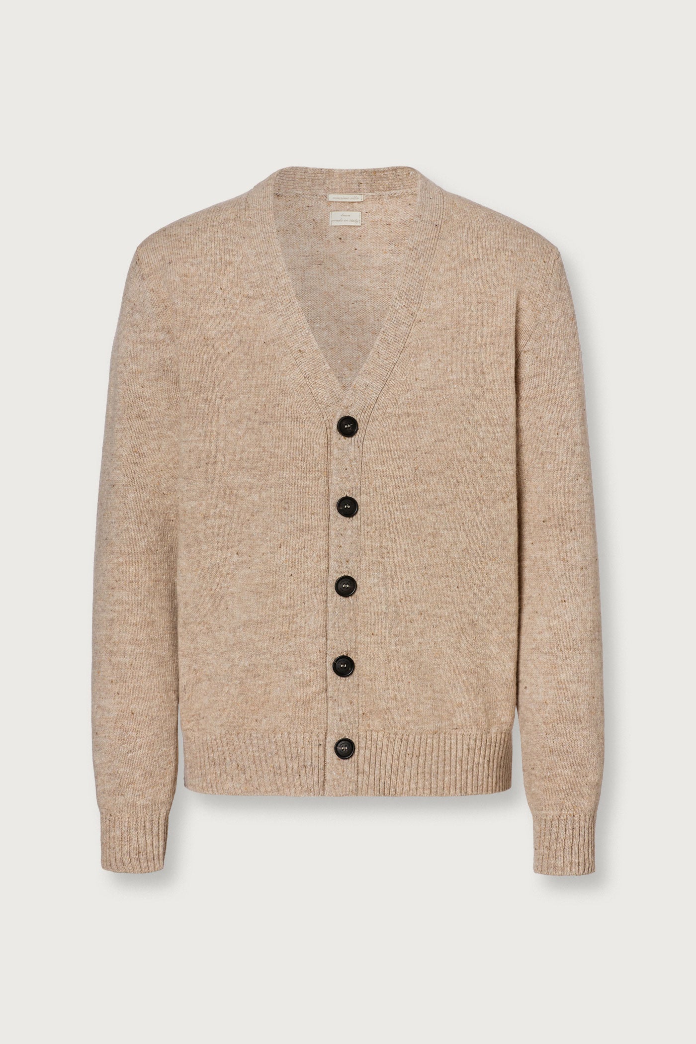 Boxy fit cardigan with four horn buttons, high flat ribbed edges. Made from soft virgin Shetland wool. Made in Italy.