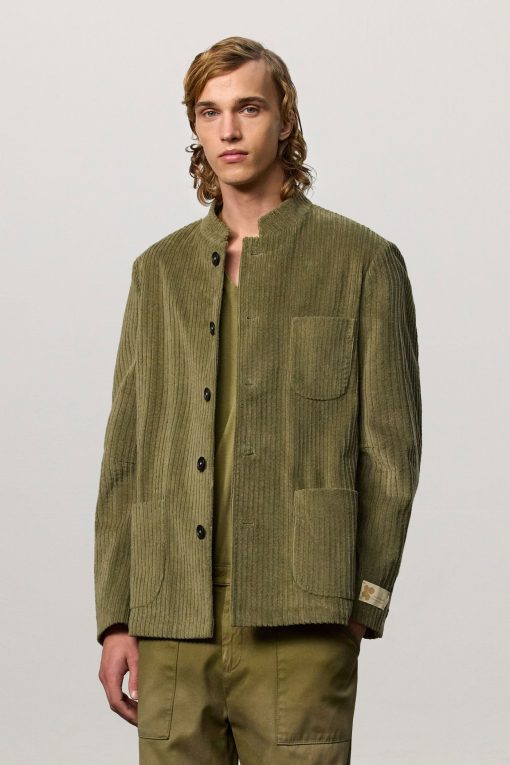 Regular-fit single-breasted jacket with a stand-up collar, patch pockets, side slits, and five horn buttons. Made in stretch cotton corduroy. Made in Italy.