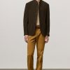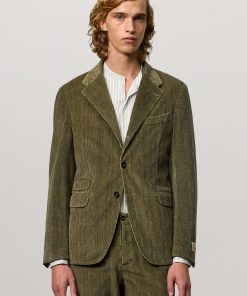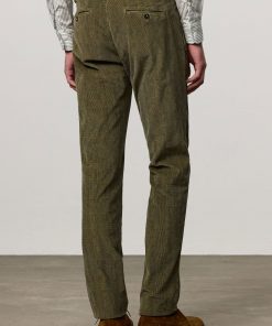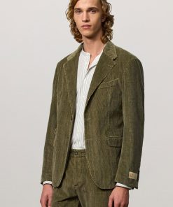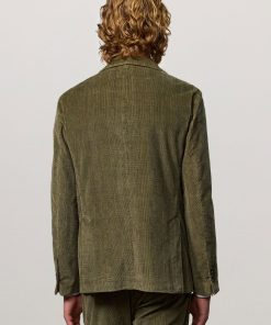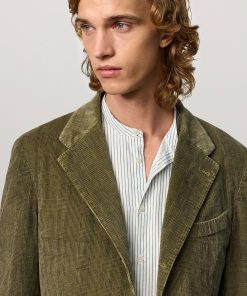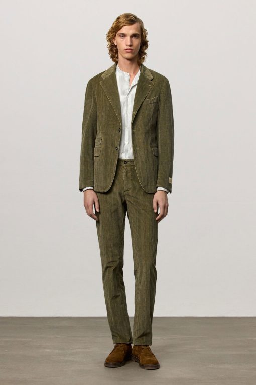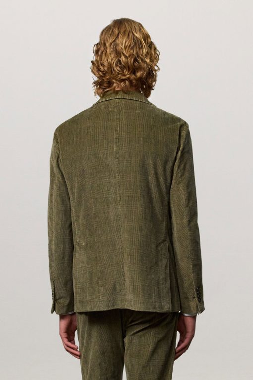 Casual deconstructed suit with three-button jacket, regular fit, classic notched lapel with stitching, flap pockets, dark horn buttons, two back vents, flat-front trousers, slim fit, straight leg, made in comfort Prince of Wales velvet. Made in Italy.