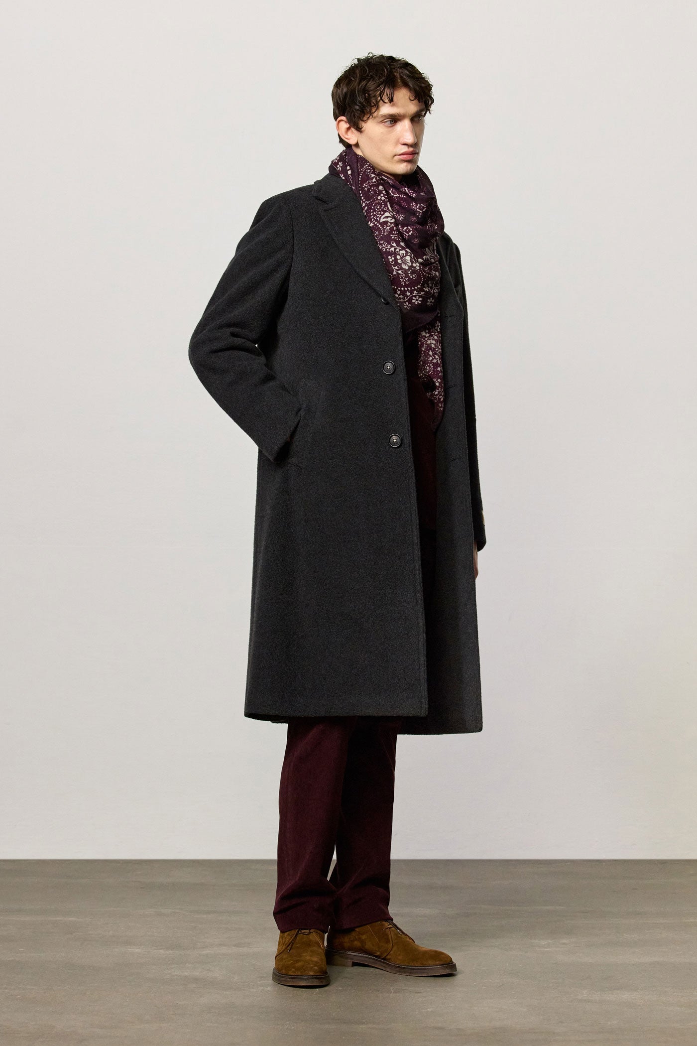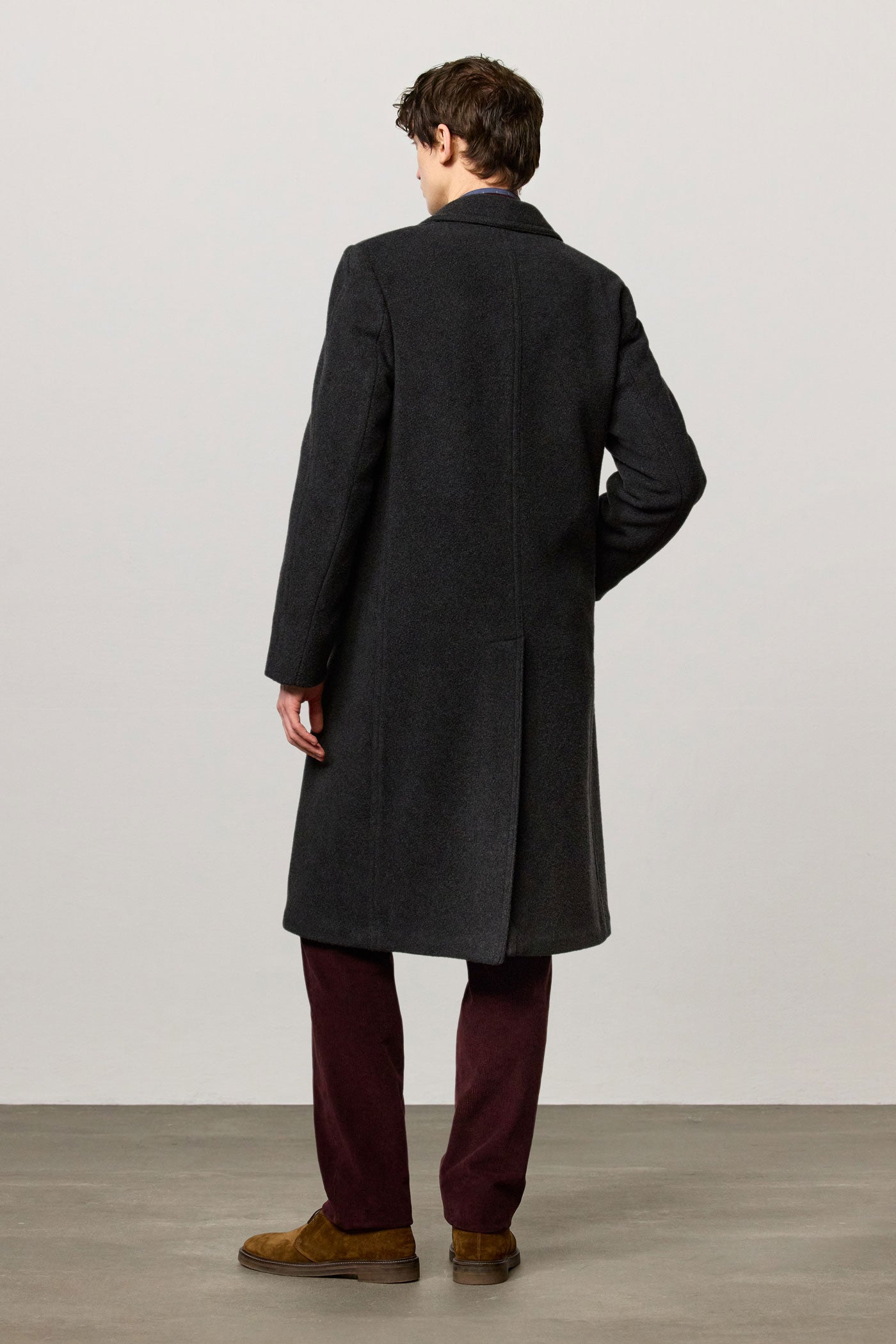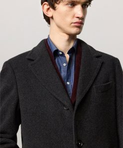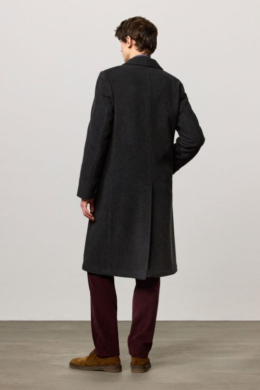 Single-breasted coat in brushed virgin wool and cashmere fabric with horn buttons. Made in Italy.