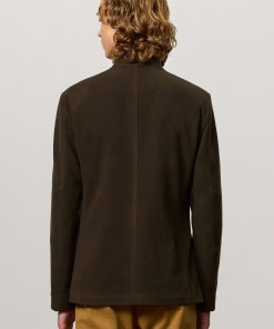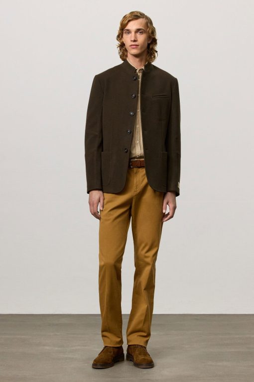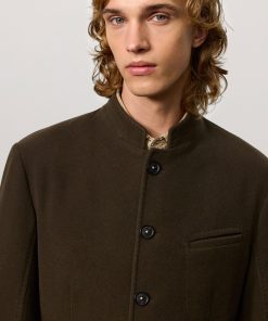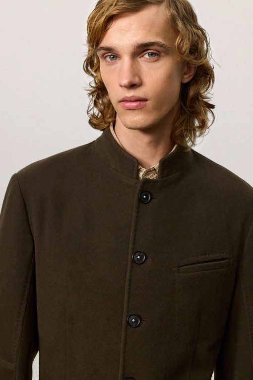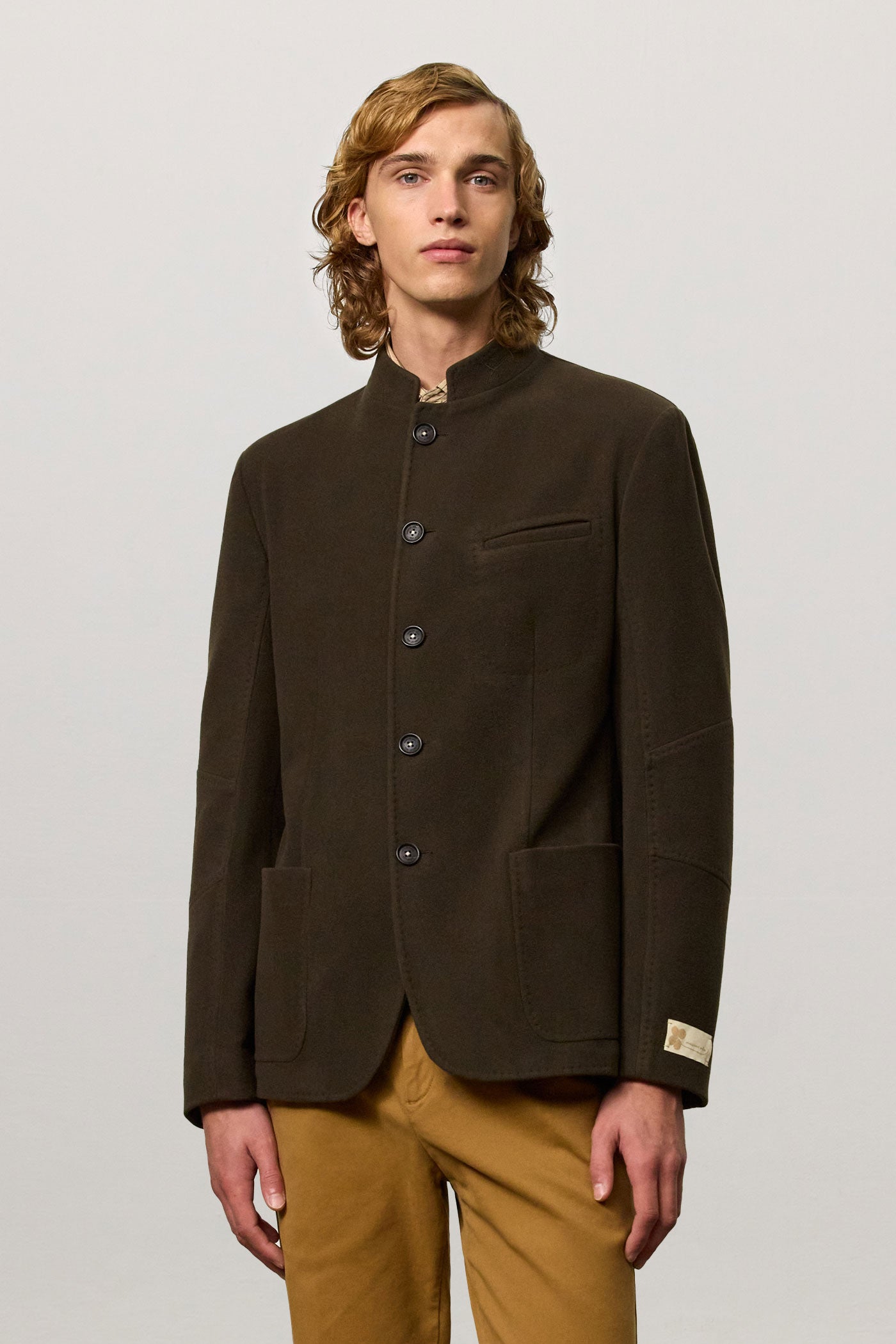 Military-inspired jacket with guru collar, single-breasted, deconstructed and unlined, with patch pockets, dark horn buttons, made in a compact virgin wool fabric. Made in Italy.