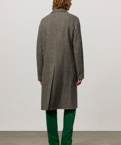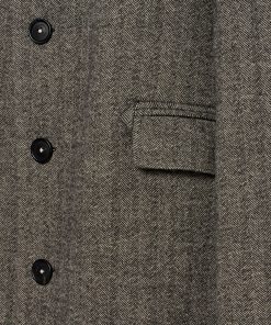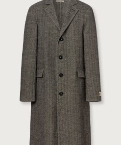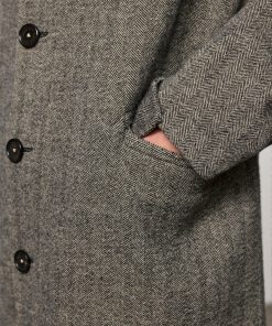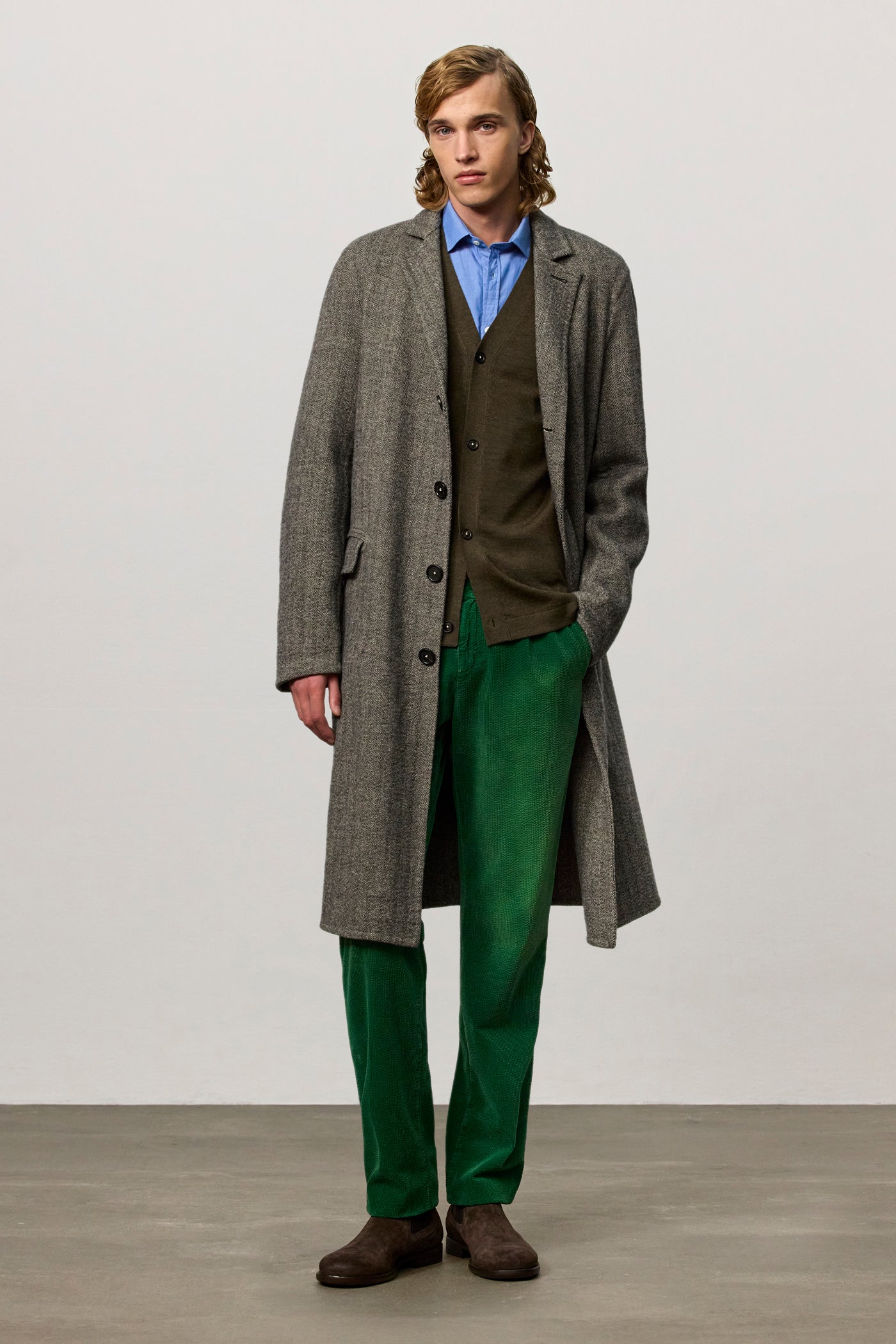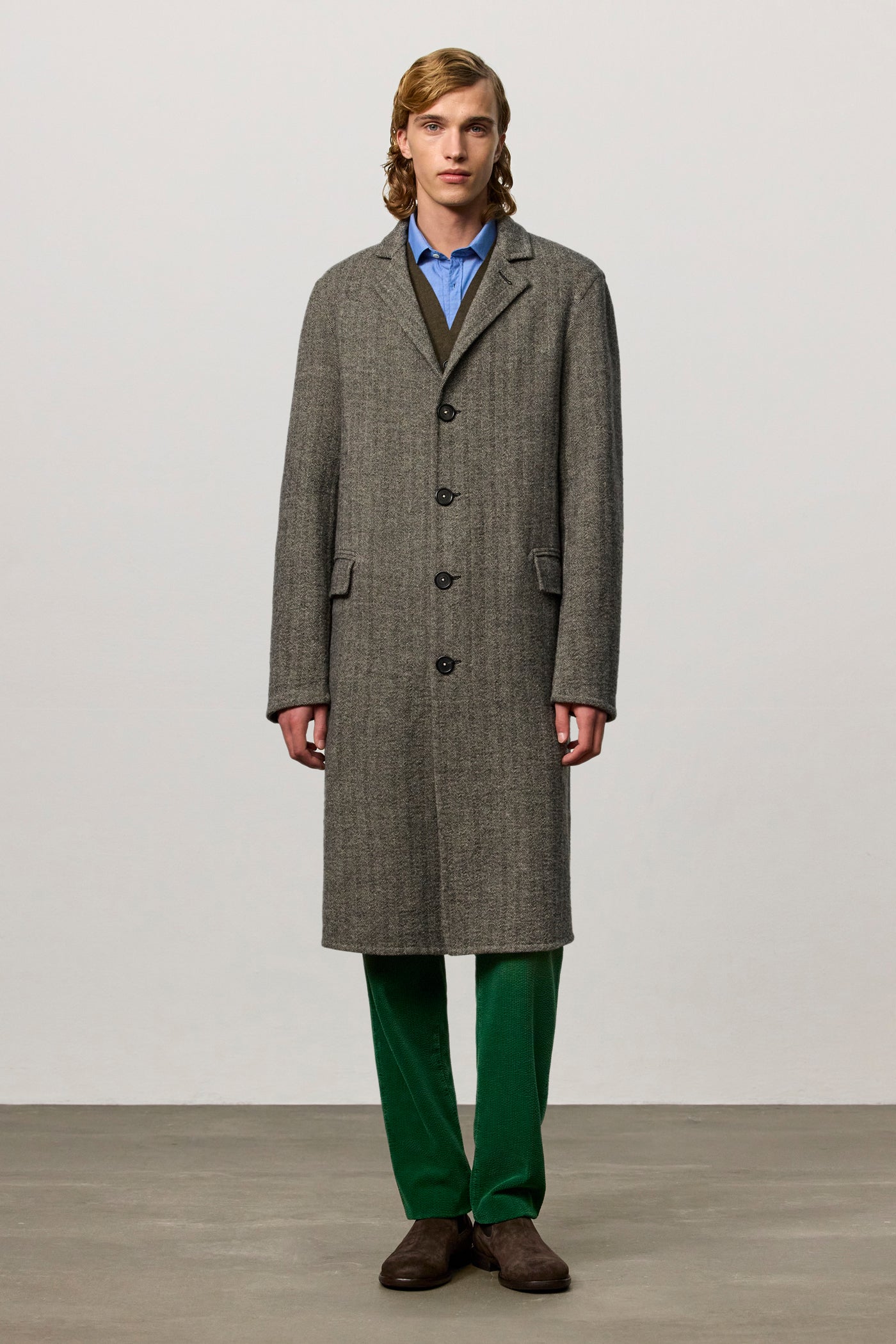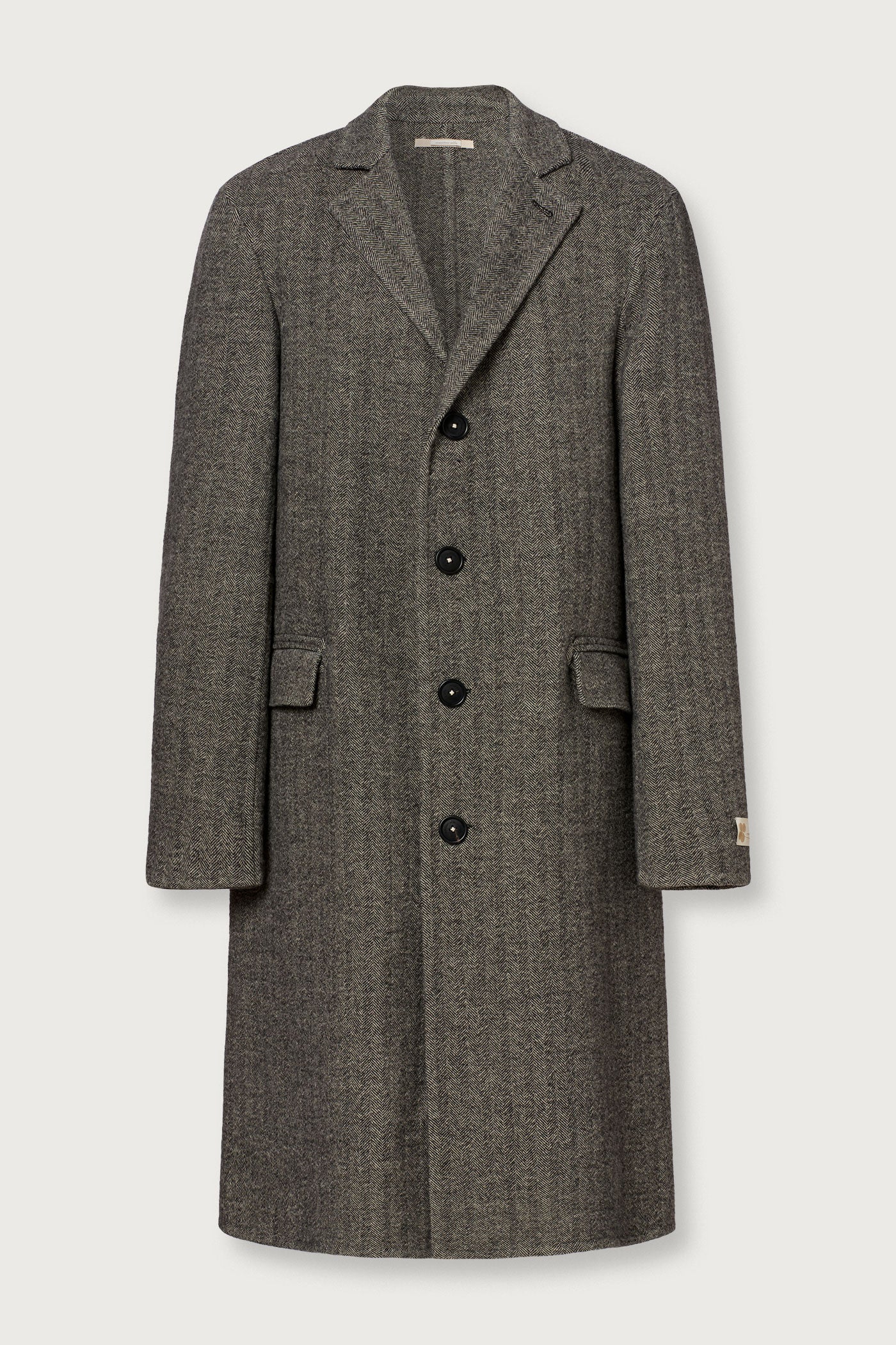 Classic fit single-breasted coat, four horn buttons, tall lapels, welt pockets with flaps, hand finished. Made in soft virgin wool double herringbone fabric. Made in Italy.