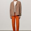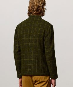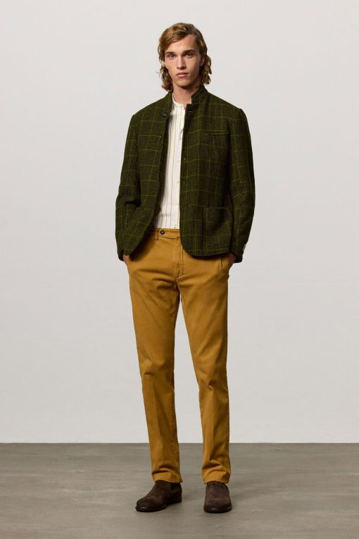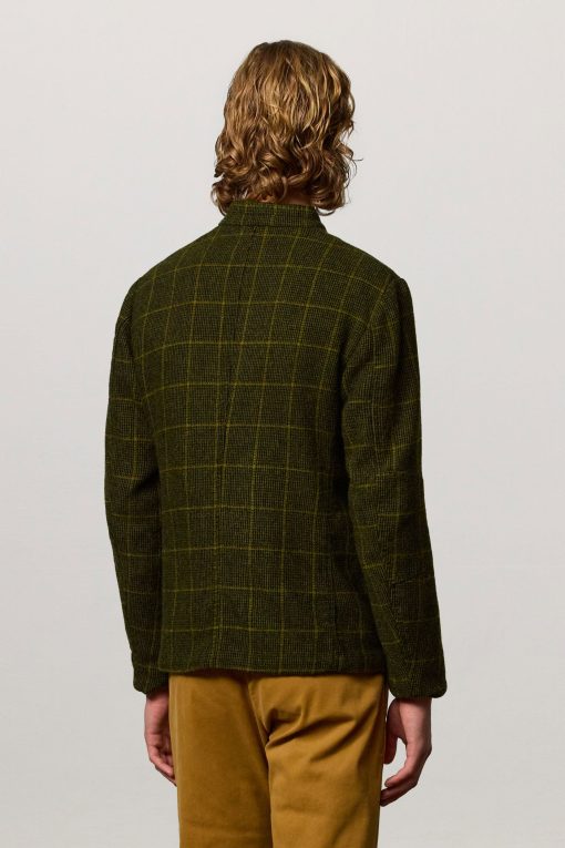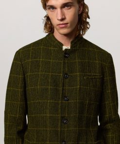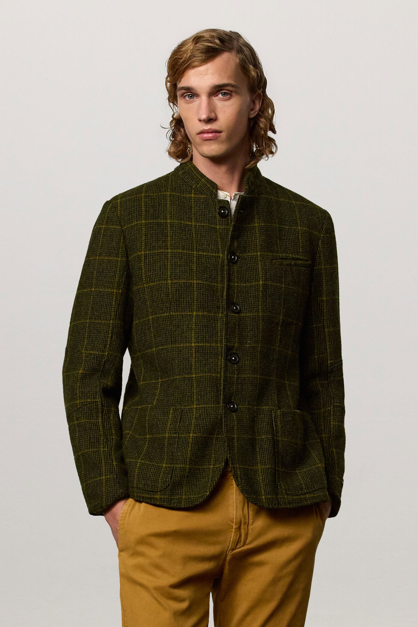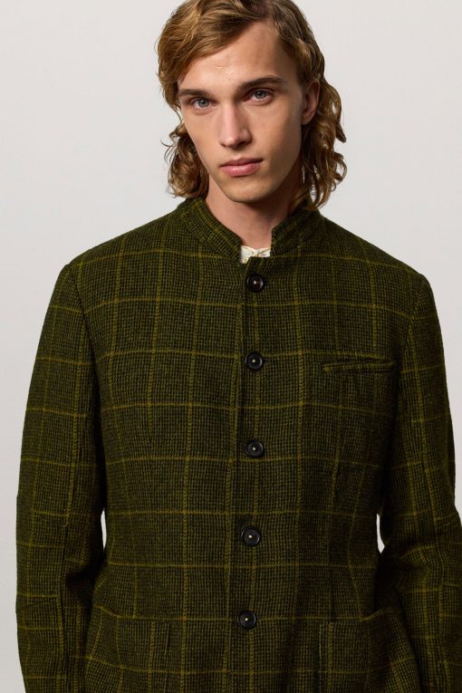 Military-inspired jacket with guru collar, single-breasted, deconstructed and unlined, with patch pockets, dark horn buttons, made of checked wool cloth. Made in Italy.