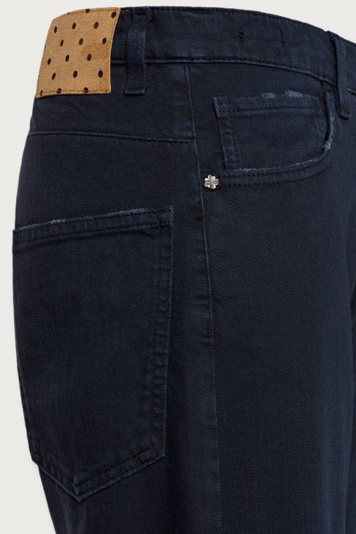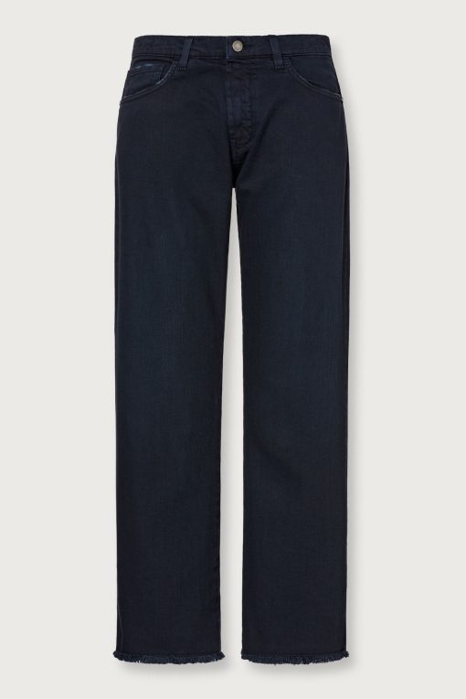 Loose-fit five-pocket boyfriend trousers, straight cut, ankle length with frayed hems. Made from slub bull-weave fabric in comfort cotton. Made in Italy.