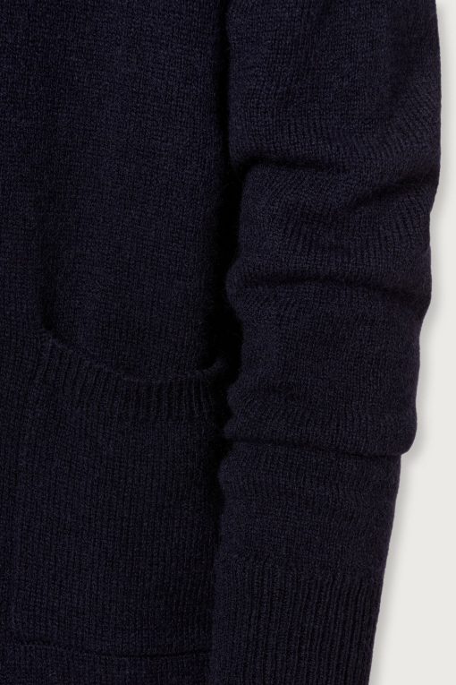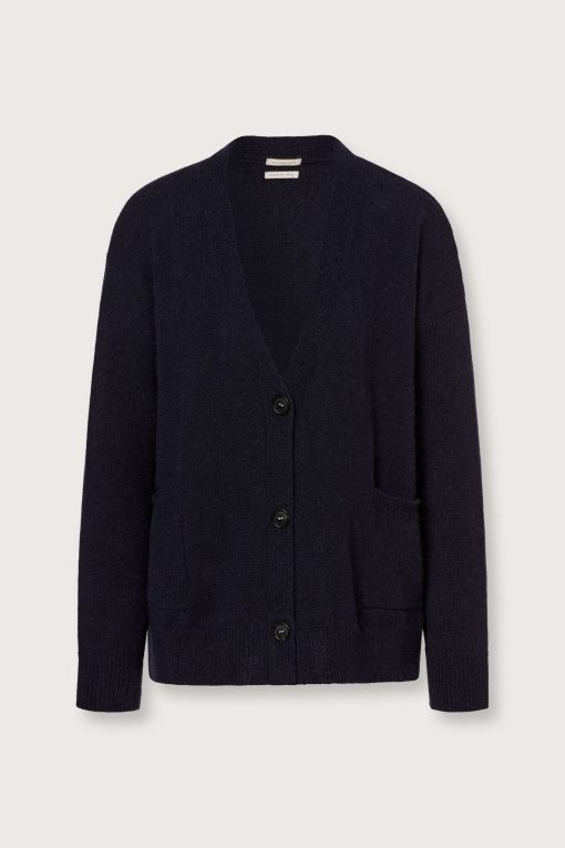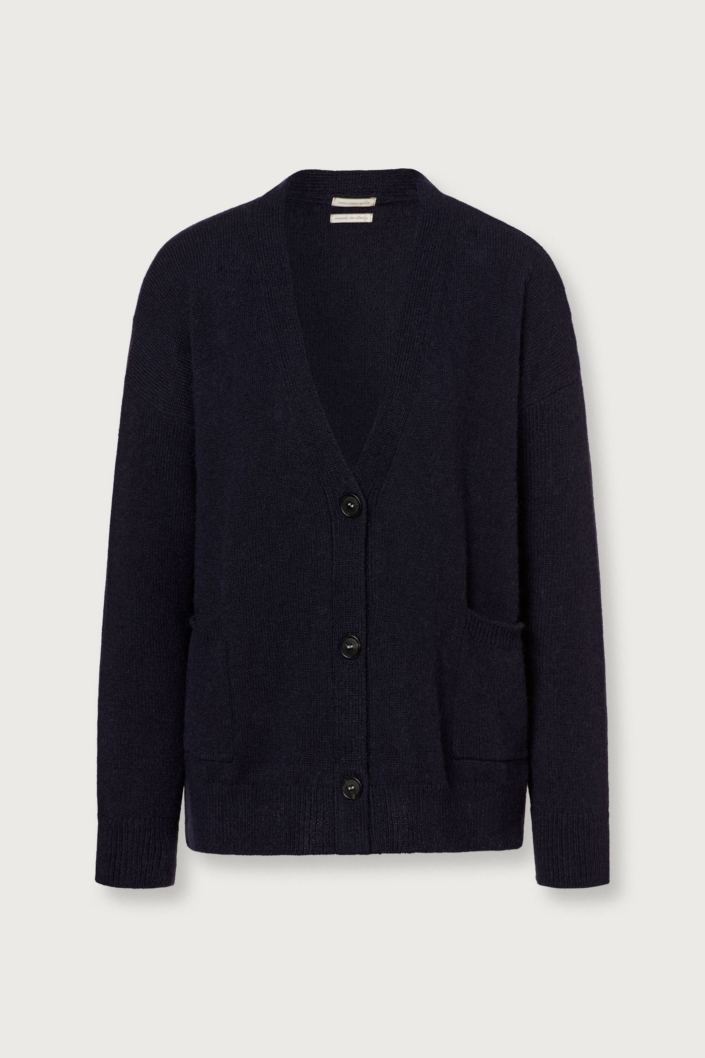 Boxy fit cardigan with three buttons, bell-shaped sleeves, high flat ribbed edges, and two front patch pockets. Made from a combed cashmere and alpaca blend. Made in Italy.