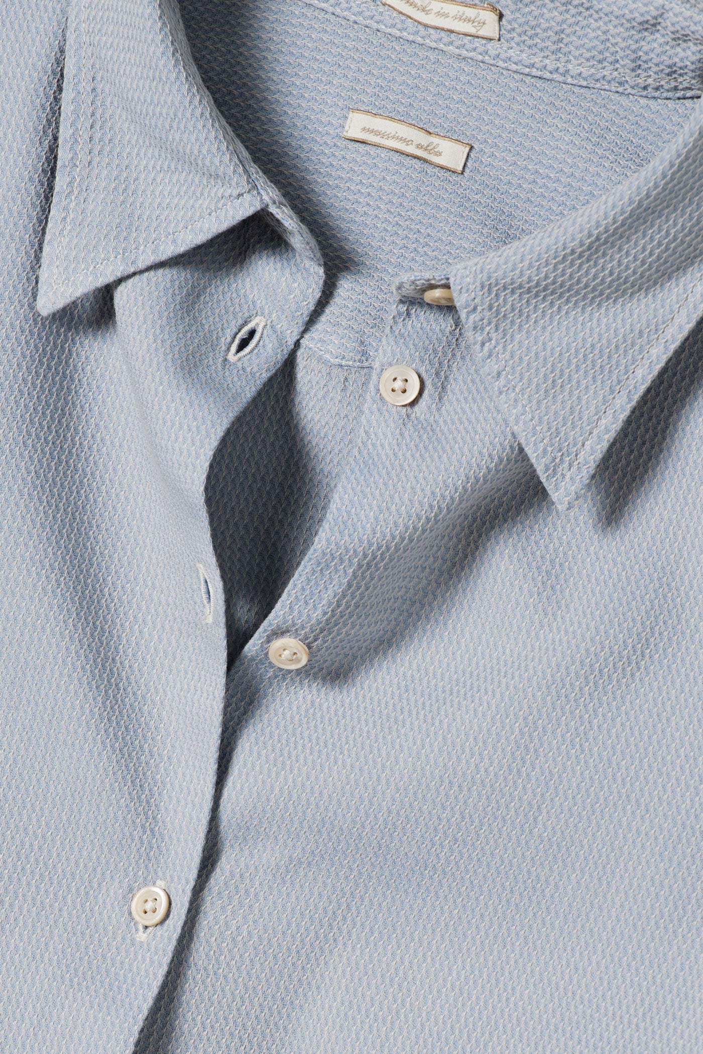 Relaxed-fit shirt with a pointed collar, back yoke, and no front placket. Made of micro jacquard watercolor cotton. Made in Italy.