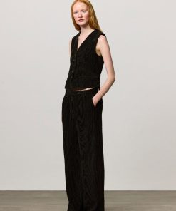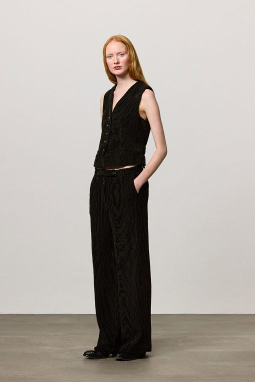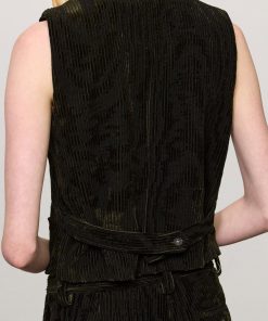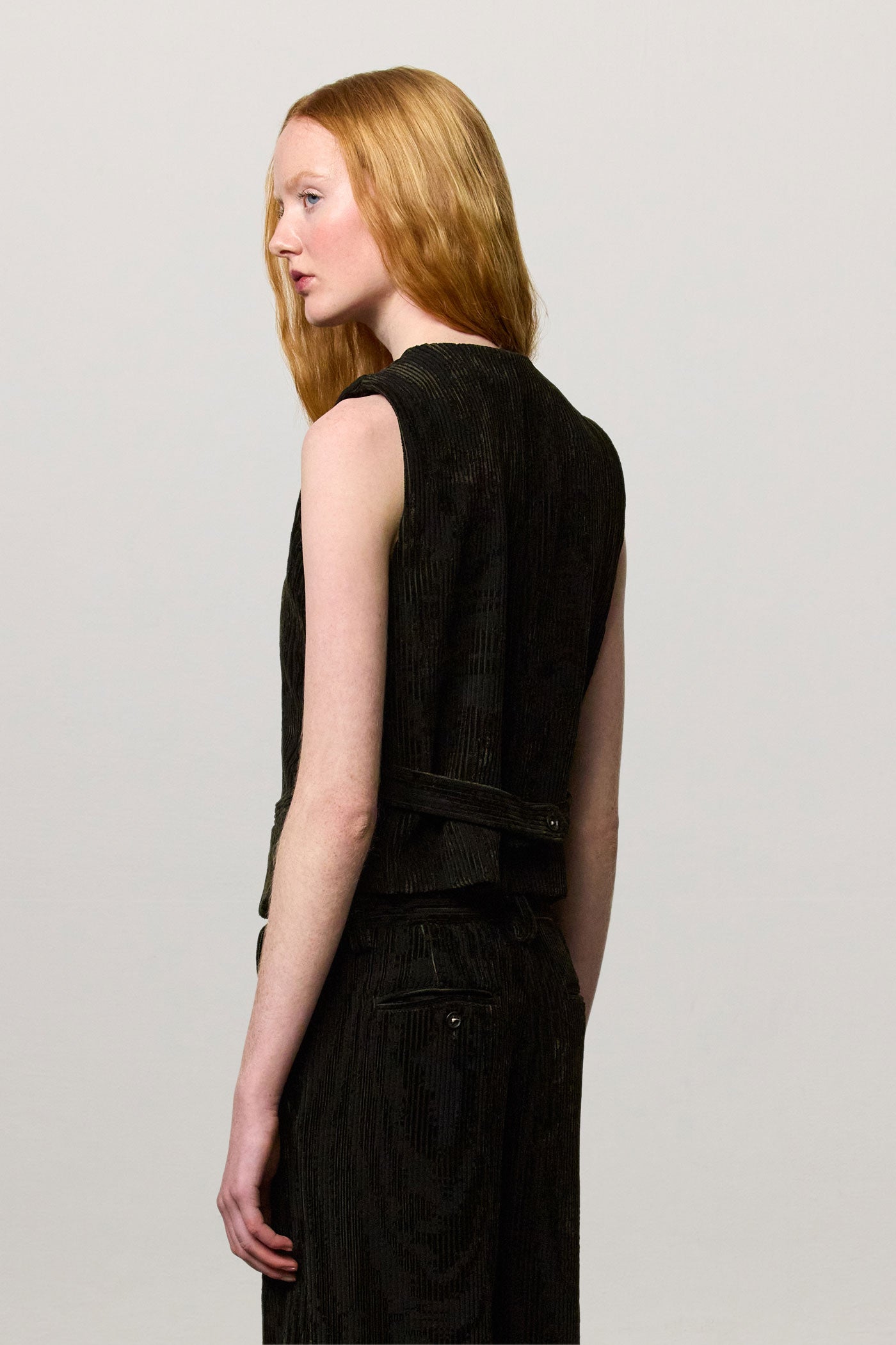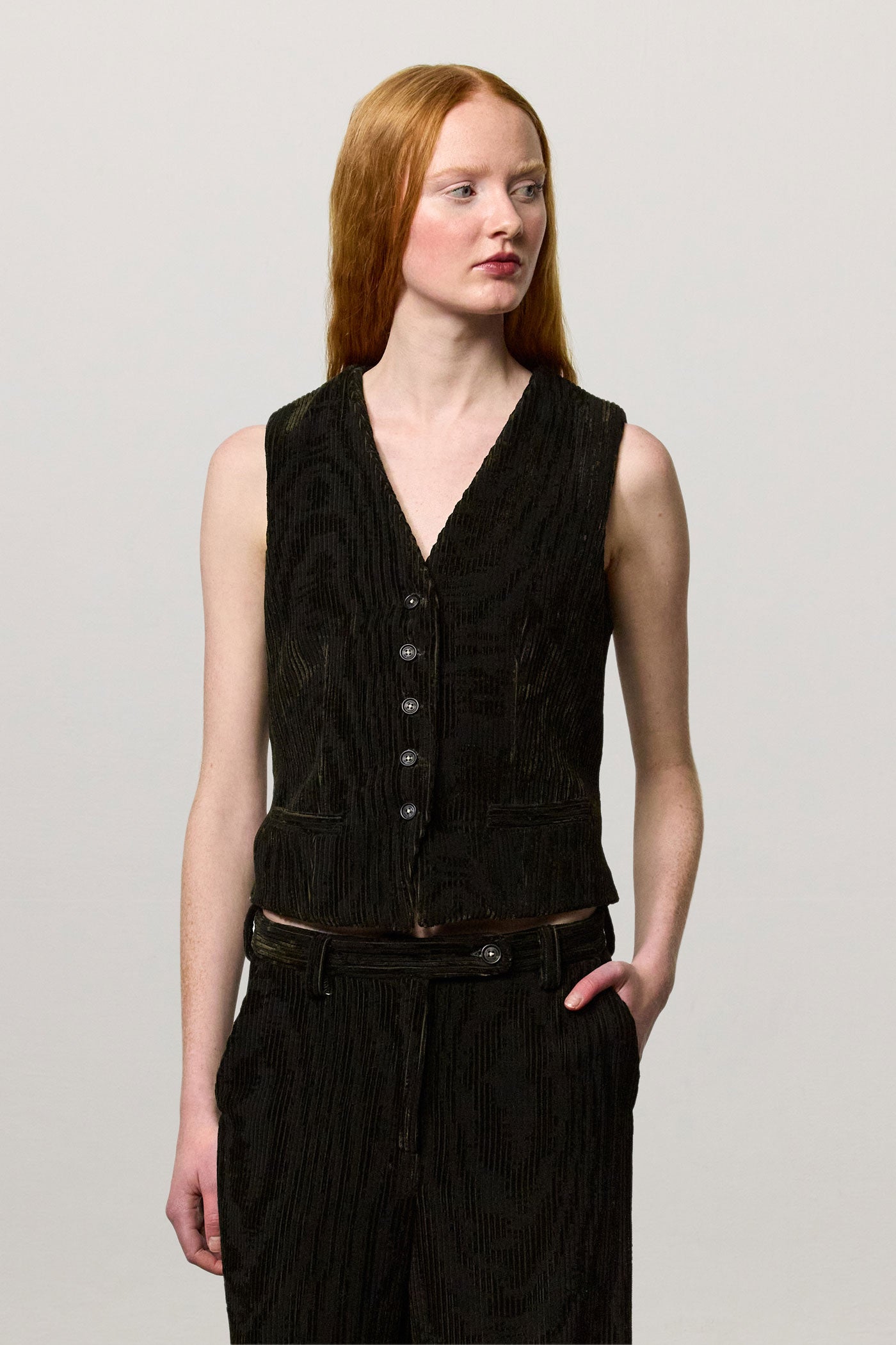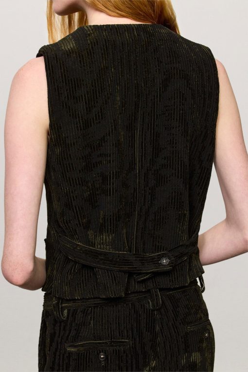 Vest with V-neckline, welt pockets, horn button closure, full lining and adjustable back strap with two buttons. Crafted from bi-colour cotton corduroy jacquard velvet. Made in Italy.
