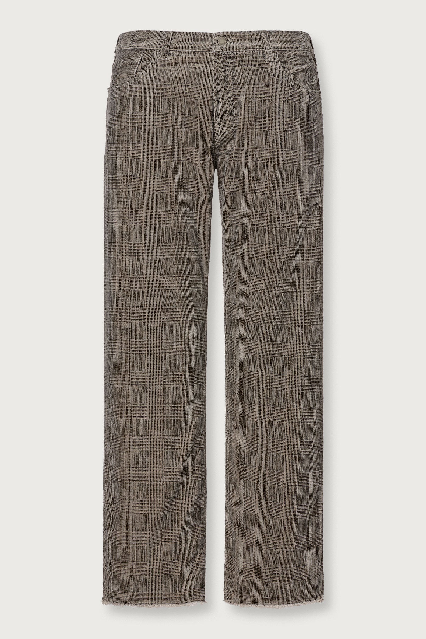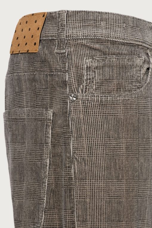 Loose-fit five-pocket boyfriend trousers, straight cut, ankle length with frayed hems. Made from comfort Prince of Wales velvet. Made in Italy.